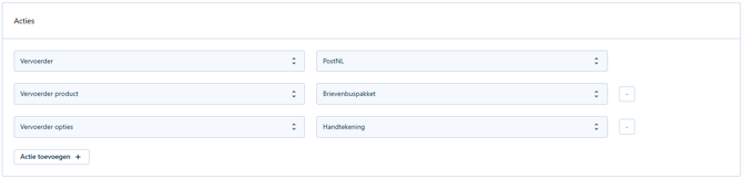 Bij het kiezen van een vervoerder zal er standaard voor een pakje gekozen worden, als je bij bepaalde vervoerders een brievenbus pakje wilt meegeven kan je een tweede actie instellen voor een brievenbus pakje.